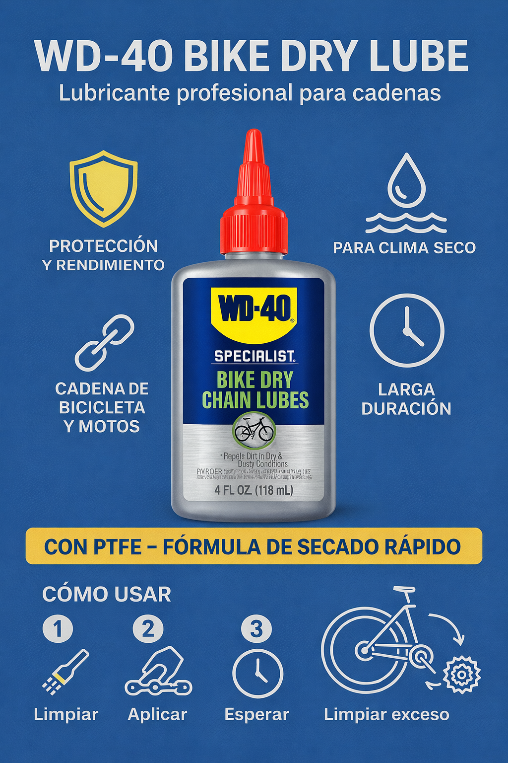 En este artículo, te explicamos todo lo que necesitas saber sobre el WD-40 BIKE Lubricante de Cadenas para Ambiente Seco, por qué su fórmula con PTFE es ideal para rutas secas y polvorientas, y cómo aplicarlo correctamente para sacarle el máximo partido.